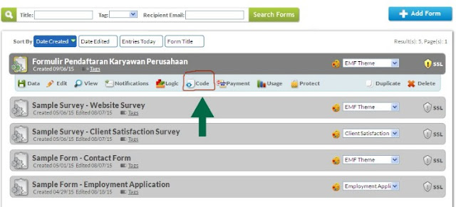 5. Formulir yang kita buat sudah tersimpan di Manager Form. dan silakan klik code untuk mendapatkan kode formulir yang sudah kita buat.